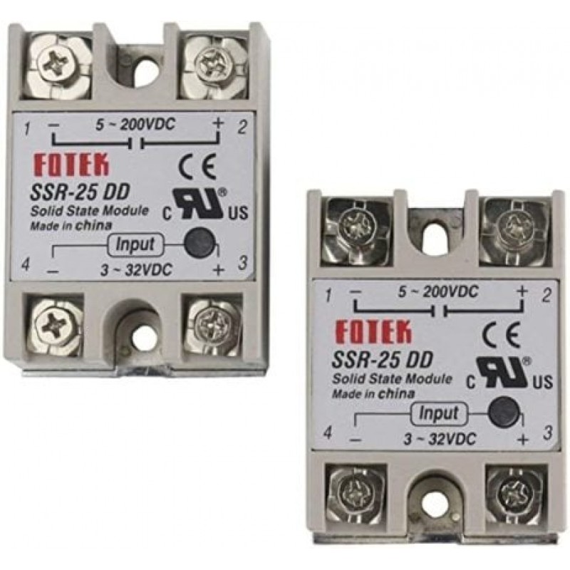 This is DC To DC SSR-25DD Solid State Relay Module 3-32VDC/5-200VDC 10A. A solid-state relay (SSR) is an electronic switch, which, unlike an electromechanical relay, contains no moving parts. The types of SSR are photo-coupled SSR, transformer-coupled SSR, and hybrid SSR. A photo-coupled SSR is controlled by a low voltage signal which is isolated optically from the load.