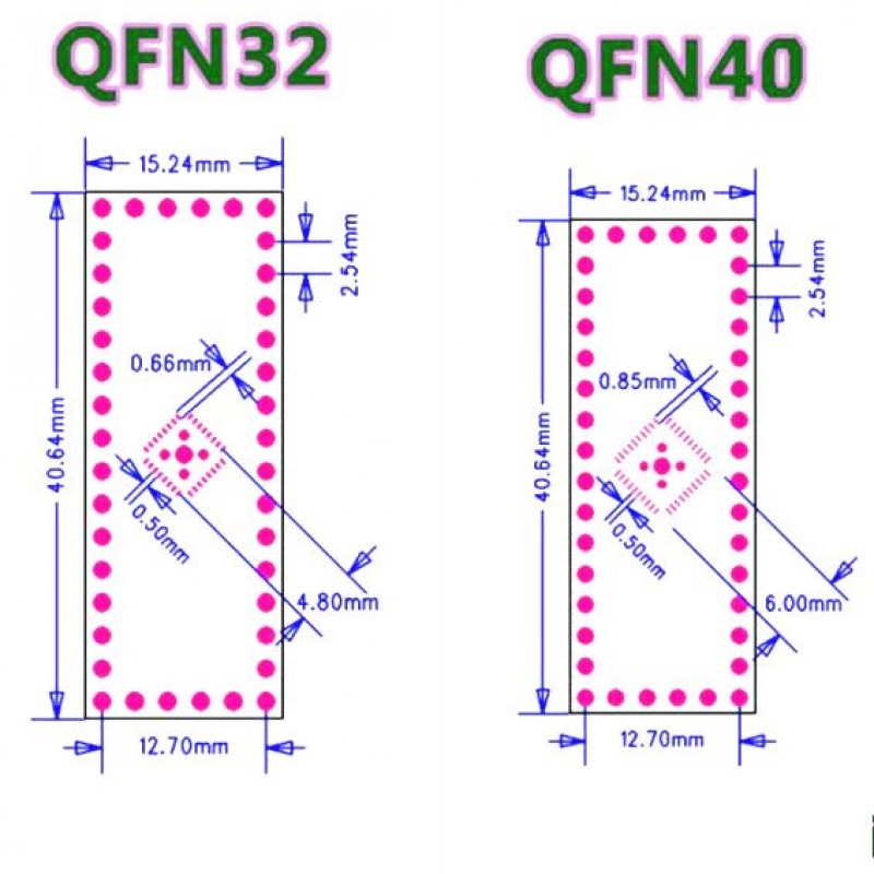 QFN32 QFN40 SMD to DIP Adapter PCB Board is a very high-quality double-sided adapter PCB for QFN32 on one side and QFN40 on another side with 0.5mm pitch. with the ground plane. suitable for converting QFN32 and QFN40 chips into DIP32 and DIP40 packages for the easy prototype in the breadboard.
