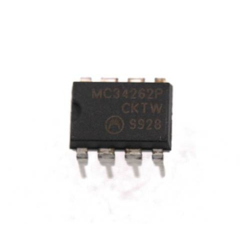 The MC34262 is active power factor controller specifically designed for use as a preconverter in electronic ballast and in off−line power converter applications. These integrated circuits feature an internal startup timer for stand−alone applications, a one quadrant multiplier for near unity power factor, zero current detector to ensure critical conduction operation, transconductance error amplifier, quickstart circuit for enhanced startup, trimmed internal bandgap reference, current sensing comparator, and a totem pole output ideally suited for driving a power MOSFET. Also included are protective features consisting of an overvoltage comparator to eliminate runaway output voltage due to load removal, input undervoltage lockout with hysteresis, cycle−by−cycle current limiting, multiplier output clamp that limits maximum peak switch current, an RS latch for single pulse metering, and a drive output high state clamp for MOSFET gate protection. The device is available in dual−in−line plastic package.
