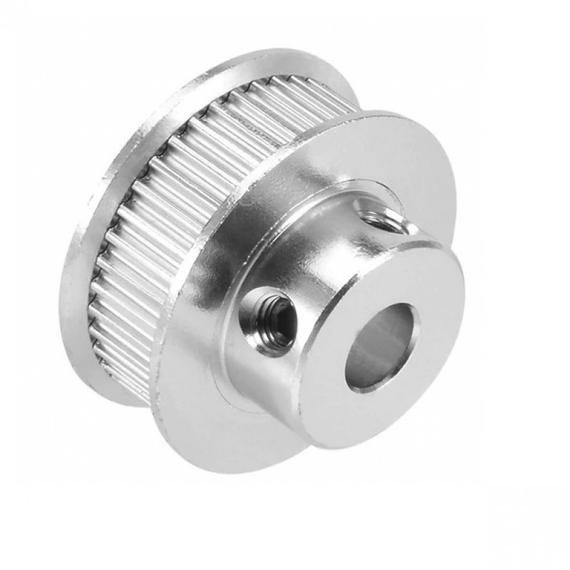This pulley has 40teeth and a 5mm inner bore. Two set screws can be used to attach it firmly to any 5mm diameter shaft. Full aluminum construction means these are very light and very durable.