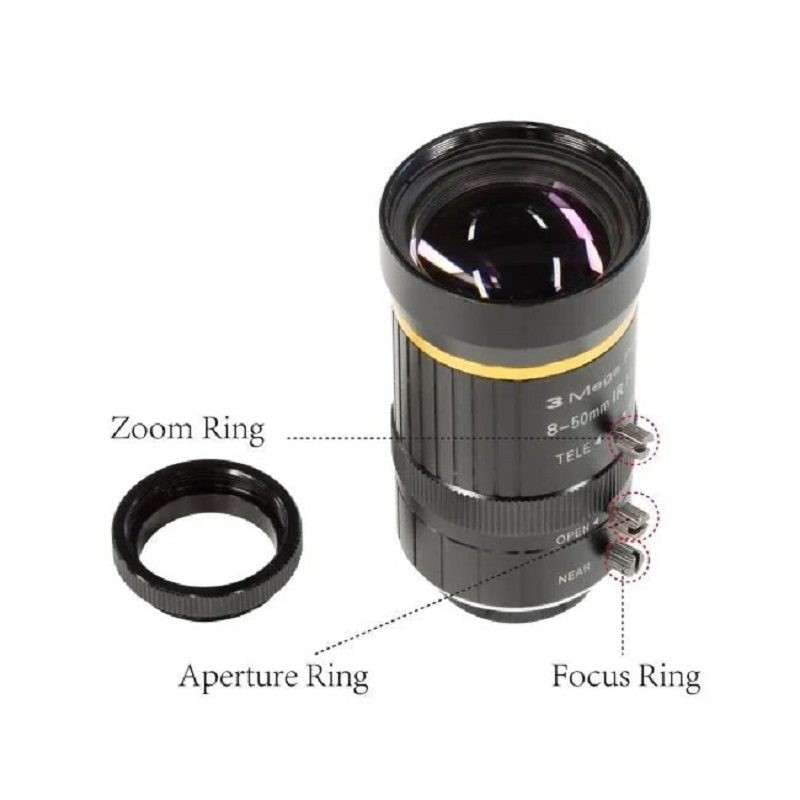This is 8-50mm C-Mount Zoom Lens is designed for the Raspberry Pi High Quality Camera featuring the 12MP IMX477 sensor. With its adjustable 8-50mm focal length, this lens offers flexible zoom capabilities, making it ideal for applications that require variable focus, such as surveillance, industrial inspection, and photography projects. Its C-mount design ensures easy installation and compatibility with the RPi HQ Camera.