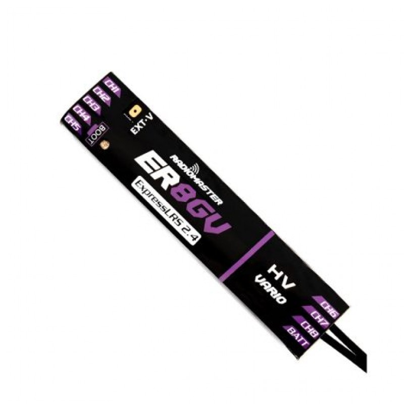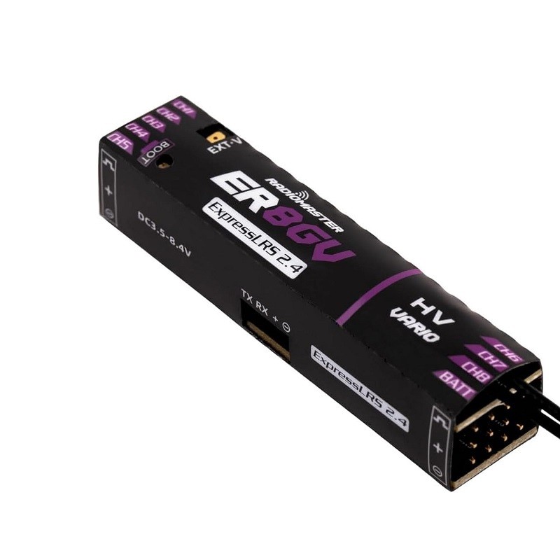 The Radiomaster ER8GV 2.4GHz ELRS PWM Receiver have been specially designed for glider pilots who require a compact and slim receiver. It can drive up to 8 servos and has built-in receiver voltage telemetry and flight battery telemetry with the ability to automatically detect which voltage input to use (only one voltage input can be used at the any given time). Both ER8G & ER8GV feature a dual-antenna with telemetry power up to 100mw and can be used with a 1S Lipo receiver battery.