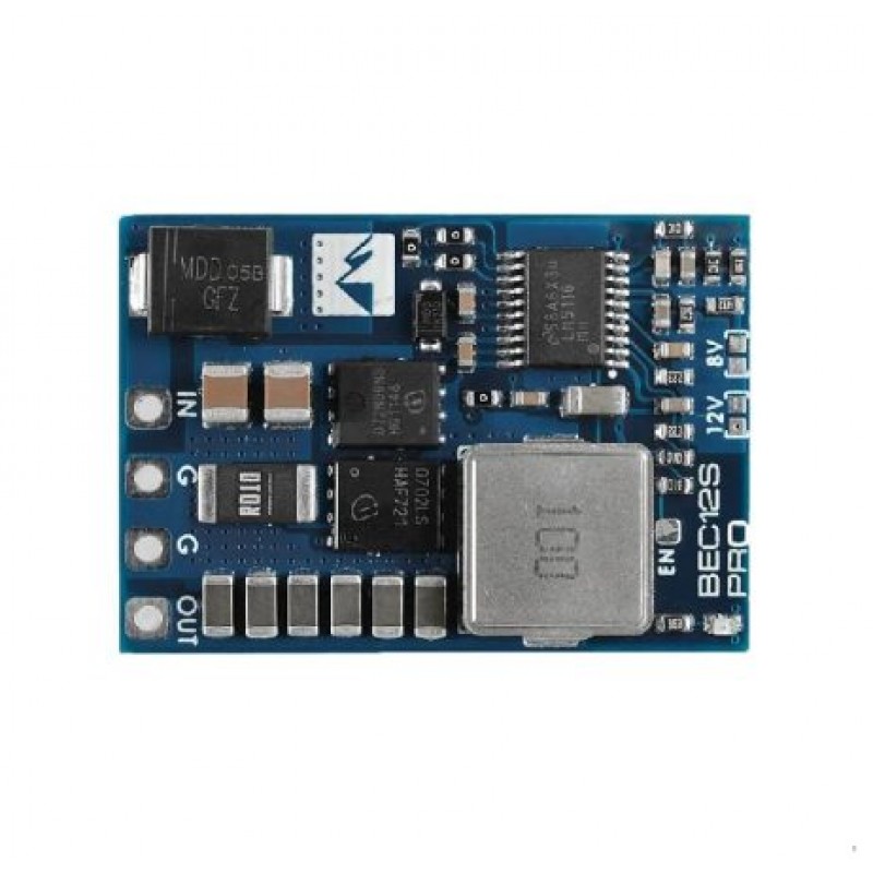 TheMATEKSYS 12S Pro BECfeatures a wide9-55VOperating Input Range, 3x Output Voltage Options 5V/8V/12V, and Supports continuous output current of up to 5A, a peak current of 9A. This voltage regulator also features a synchronous switching step-down (buck) regulator, thermal Shutdown, output Short-circuit tolerance (2 seconds), overcurrent protection & self-recovery, and much more.