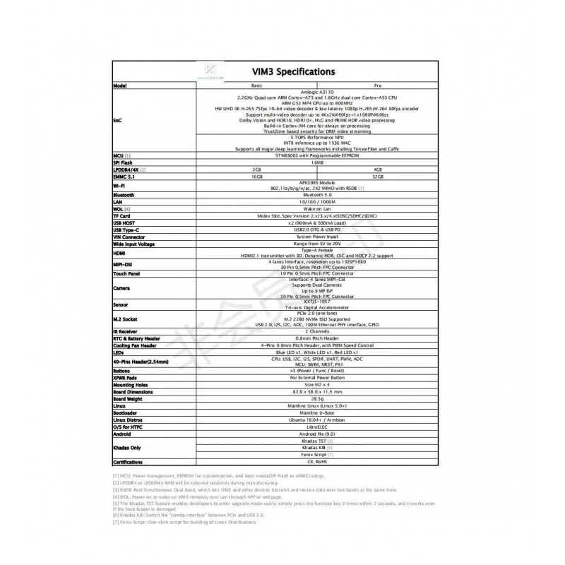 The VIM3 Pro SBC is the latest addition to our popular Khadas VIM series. It has a powerful Amlogic A311D SoC: x4 Cortex A73 performance cores (2.2Ghz), and x2 Cortex A53 efficiency cores (1.8Ghz) are merged into a hexa-core configuration and fabricated with a 12nm process to maximize performance, thermal and electrical efficiency.