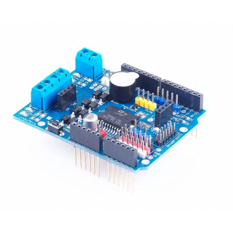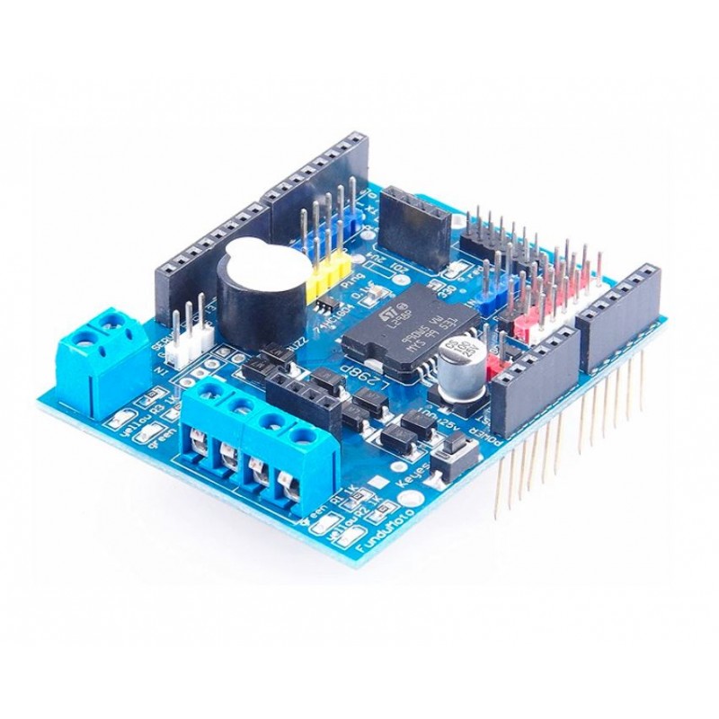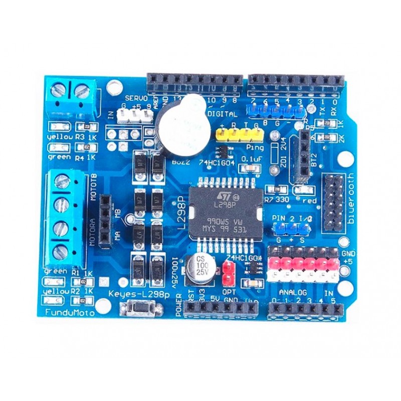This Arduino compatible motor Driver shield is a full-featured product that it can be used to drive 2 DC motor or one 4-wire stepper and one 5v servos. It drives the DC motor and stepper with the L298P, the shield drives motors with digital pins D10, D11, D12, D13, and servo with digital pin D9.