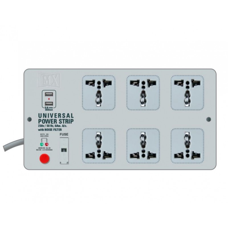 MX Power strip with 6 universal sockets and built in fuse guarantees safe operation of your electrical equipment or devices such as computers, telecommunication, video and audio products etc. Also Two USB Output used for charging your electrical equipment.