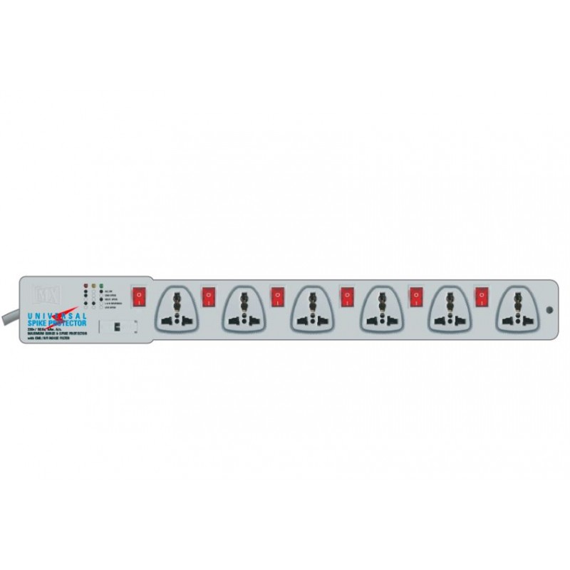 - MX 6 OUTLET UNIVERSAL SPIKE PROTECTOR has Heavy duty 3pin mains cord as per Indian BIS standard.