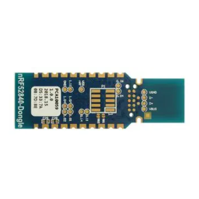 The nRF52840 Dongle is a small, low-cost USB dongle that supports Bluetooth 5.4, Bluetooth mesh, Thread, Zigbee, 802.15.4, ANT and 2.4 GHz proprietary protocols. The Dongle is the perfect target hardware for use with nRF Connect for Desktop as it is low-cost but still support all the short range wireless standards used with Nordic devices. The dongle has been designed to be used as a wireless HW device together with nRF Connect for Desktop. For other use cases please do note that there is no debug support on the Dongle, only support for programming the device and communicating through USB.
