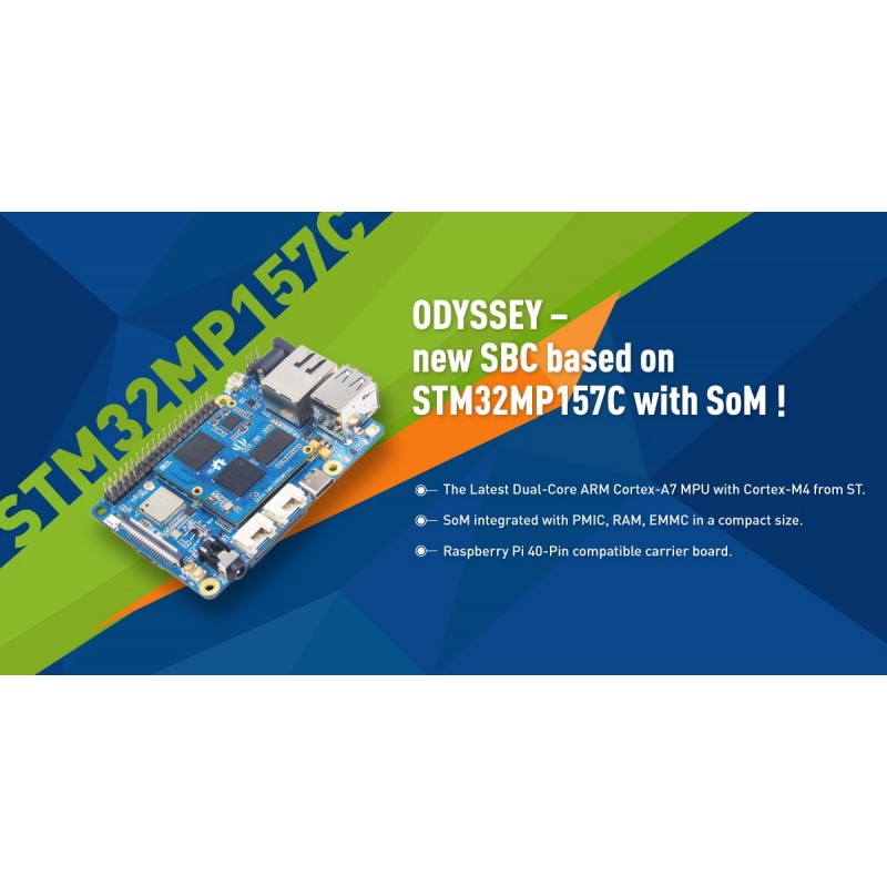 The ODYSSEY STM32MP157C is a single board computer that based on STM32MP157C, a dual-core Arm-Cortex-A7 core processor operating at 650Mhz. The processor also integrates an Arm Cortex-M4 coprocessor, which makes it suitable for real-time tasks. The ODYSSEY STM32MP157C is created in a form of SoM(system on module) plus a Carrier board. The SoM has consisted of the MPU, PMIC, RAM and the carrier board is in Raspberry Pi form factor.
