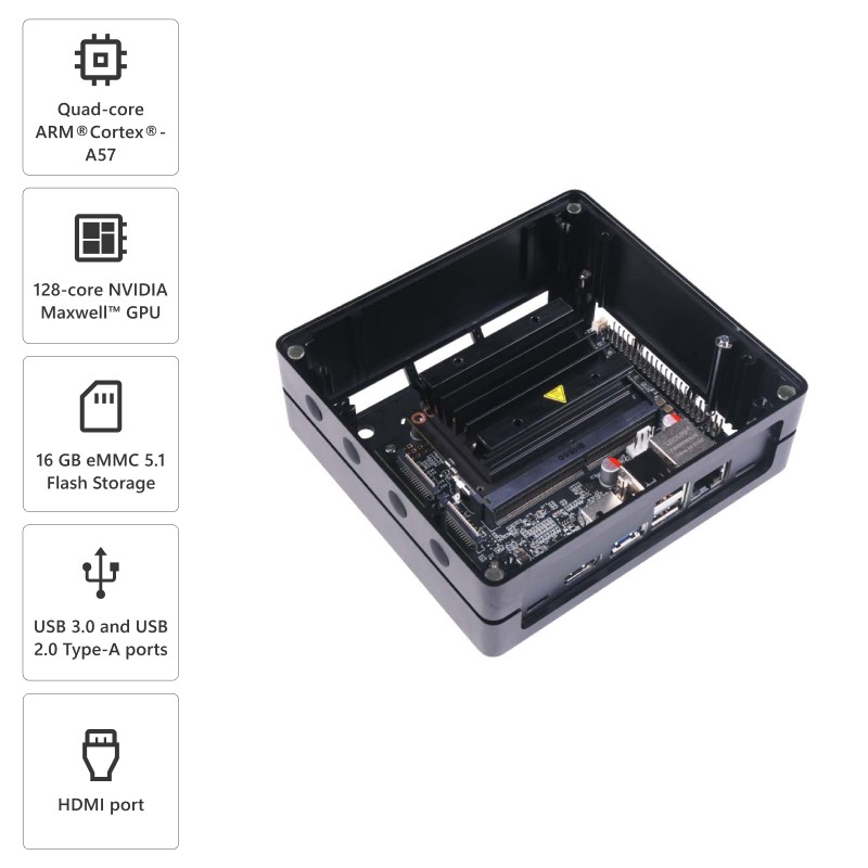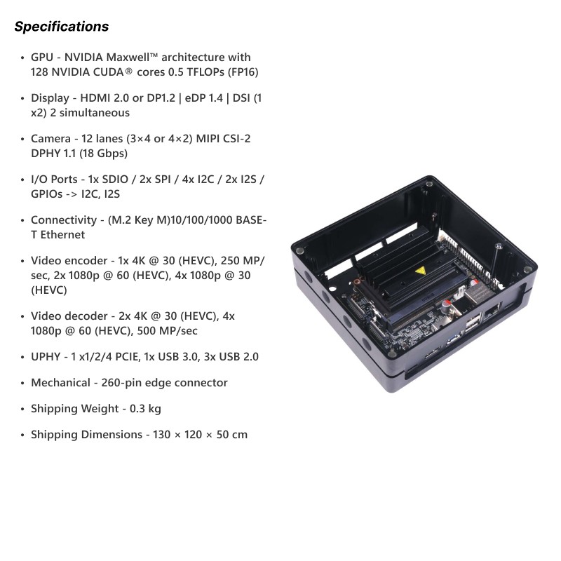 - 128-core NVIDIA MaxwellGPU with 128 NVIDIA CUDA coresdelivers 0.5 TFLOPs (FP16).