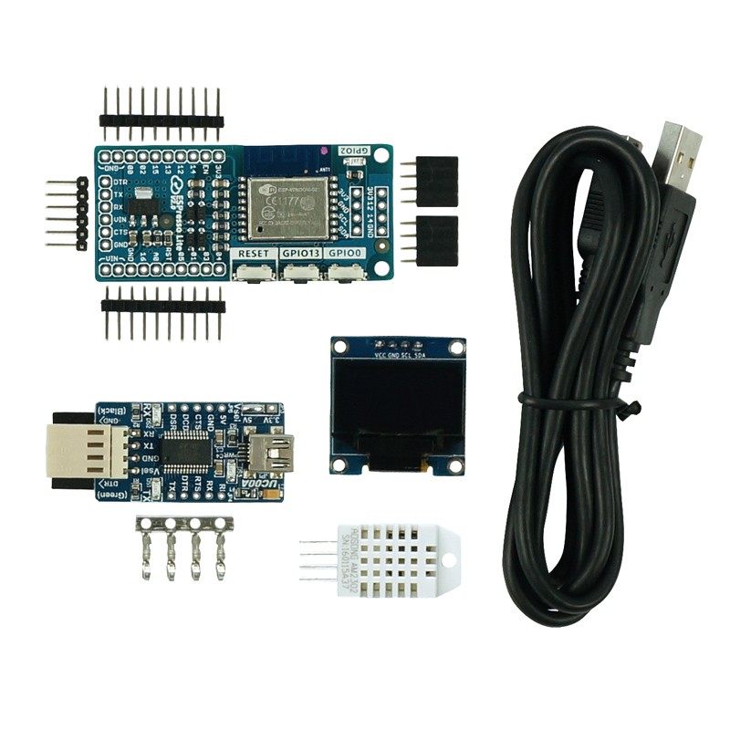 The core hardware inside ESPresso Lite V2.0 is Espressif Systems ESP8266 WROOM-02 WiFi module. Also, it is programmable using the Arduino IDE like how anyone would run their programs on other Arduino boards. With this kit, we have included the ESPresso Lite V2.0main board, UC00A (USB to UART Converter), OLED display, DHT22 sensor, and USB mini B cable (for UC00A).