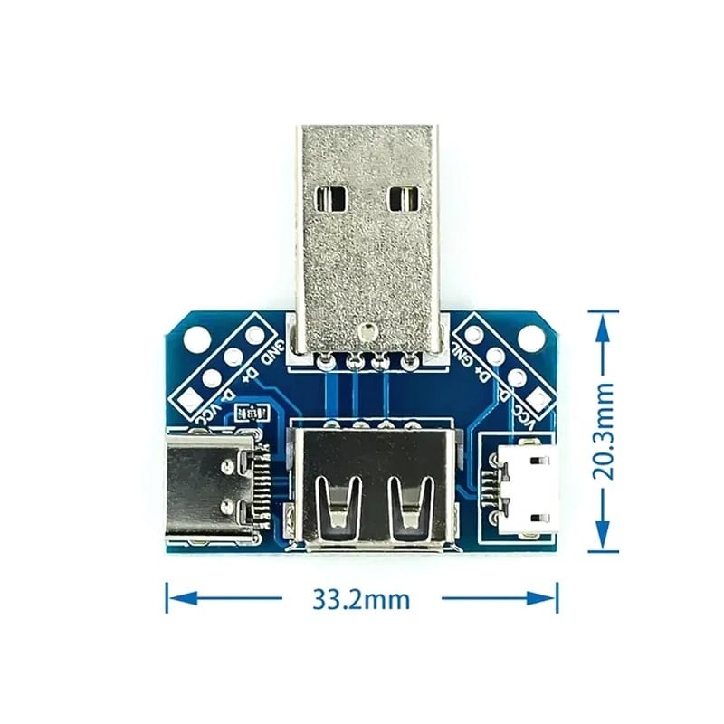 This is USB Adapter Board Male To Female Adapter Micro USB/Type-c Interface 4P 2.54mm. It is a simple interface converter. It includes 4P Terminal, Micro USB female, Type-C USB female, Type A USB male and Type A USB female. It can achieve mutual conversion between these five interfaces.It can be used as a voltage interface converter or as a data interface converter.