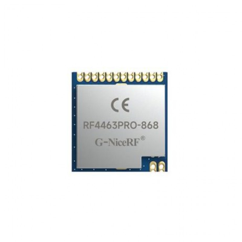 The G-NiceRF RF4463PRO-868 is a high-performance, CE-RED certified RF module designed for wireless communication in the 868 MHz ISM band. Featuring the Silicon Labs Si4463 C2 chip, it offers a receiving sensitivity of -126 dBm and a maximum output power of 20 dBm for extended range and reliable performance. With low power consumption (13.5 mA in high-performance mode) and versatile modulation options, it supports data rates from 0.1 to 1000 Kbps. The module is ideal for applications like remote control, sensor networks, and industrial control, and is compliant with RoHS and REACH standards. G-NiceRF RF4463PRO-868 operates across a wide temperature range (-40C to +85C) and simplifies certification with CE-RED approval, making it a cost-effective solution for various wireless systems.