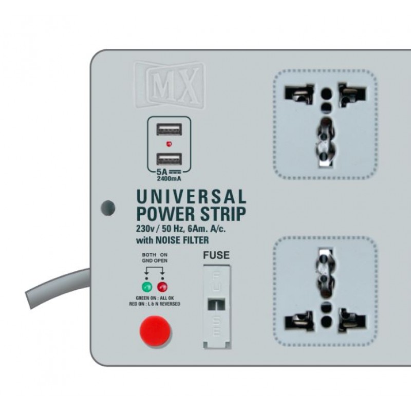 MX Power strip with 6 universal sockets and built in fuse guarantees safe operation of your electrical equipment or devices such as computers, telecommunication, video and audio products etc. Also Two USB Output used for charging your electrical equipment.