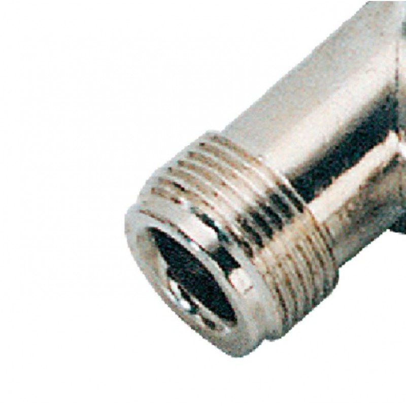 - MX N Female to N Female Right Angle connector adaptor has threaded coupling nut.