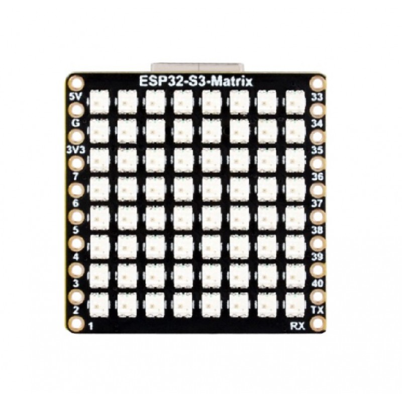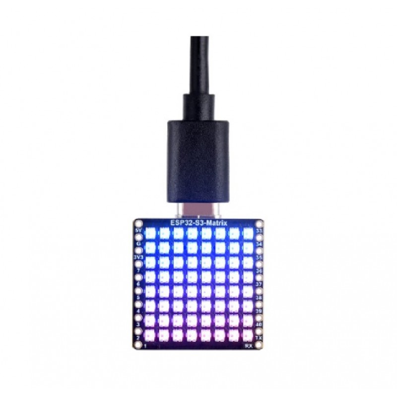 ESP32-S3-Matrix is a compact microcontroller development board with multiple digital interfaces, such as 20x GPIO pin headers, and onboard 8*8 RGB LED matrix, which can be used for displaying cool RGB LED effects or simple images.