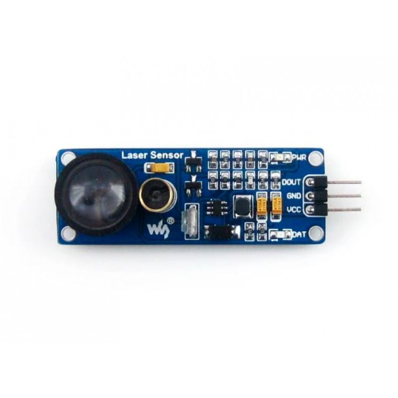 A Waveshare Laser Sensor contains a transmitter and a receiver. In the transmitter, there is an oscillating tube can generate a shockwave in a frequency of 180KHz. After amplified by a transistor, the shockwave is applied to the laser tube for exciting. In the receiver, there is a receiving tube, matching to the oscillating tube, can receive the reflected light. Since the laser sensor adopts modulation processing technology, the receiving tube can only receive the reflected light in a same frequency, efficiently preventing from the visible light.